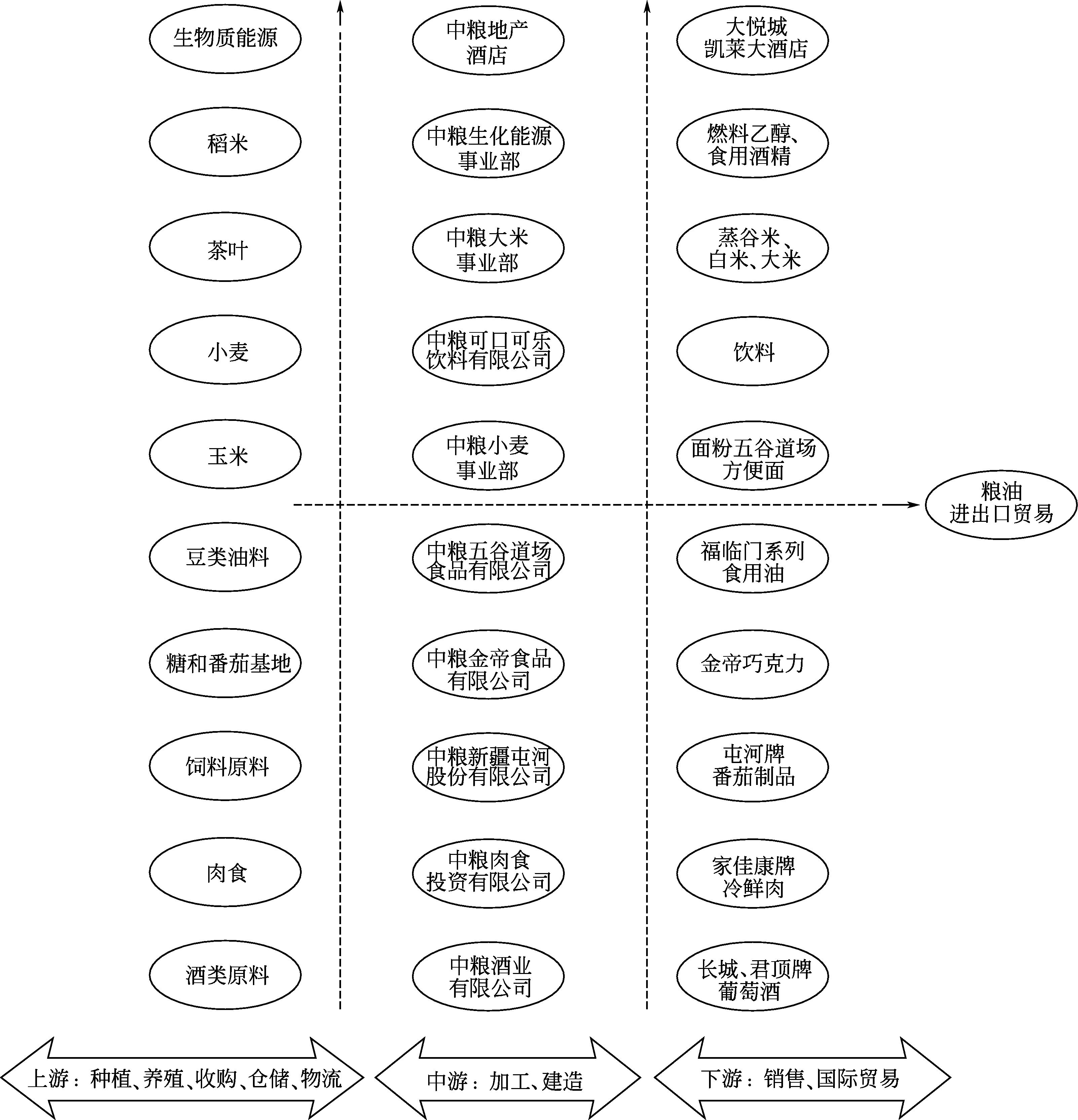 中粮集团的全产业链战略(见图1-2)主要分为上游、中游和下游三条整合途径,中粮集团针对不同的部分进行了细致的部署与规划,力求达到整体上的统一与协调。