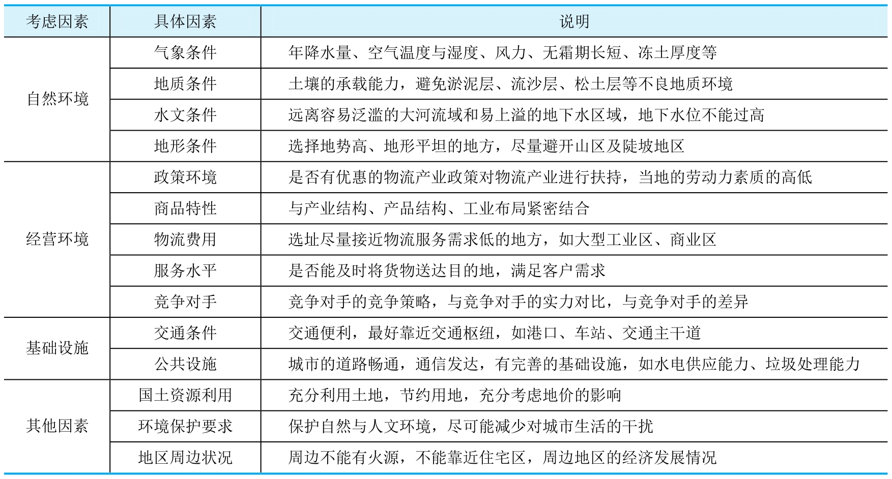 在进行仓库选址时,首先考虑自然环境、经营环境、基础设施和其他因素,见表2-2。
