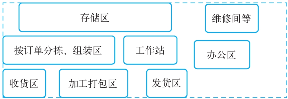在规划仓库布局时,首先要考虑仓库空间有哪些需求。仓库功能区域平面布局如图2-9所示。