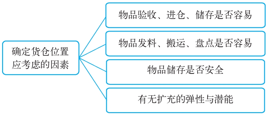 其次,要确定货仓的位置。货仓的位置因厂而异,它取决于各工厂实际需要。在确定货仓的位置时,应该考虑图2-5所示的因素。