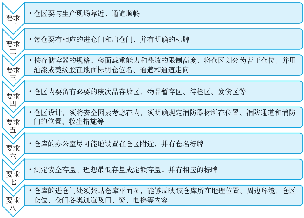 在组建、规划仓库时,应本着方便、科学的原则,应符合表2-1的要求。