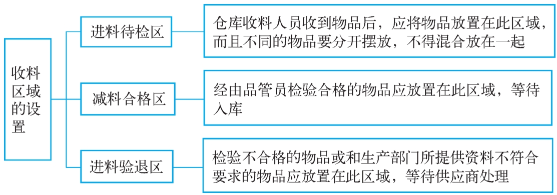 2)收料区域的设置。仓库要设有特定的收料区用于暂放所购进的物品。此收料区可划分为三个区域,具体的分区及各自的用途如图2-13所示。