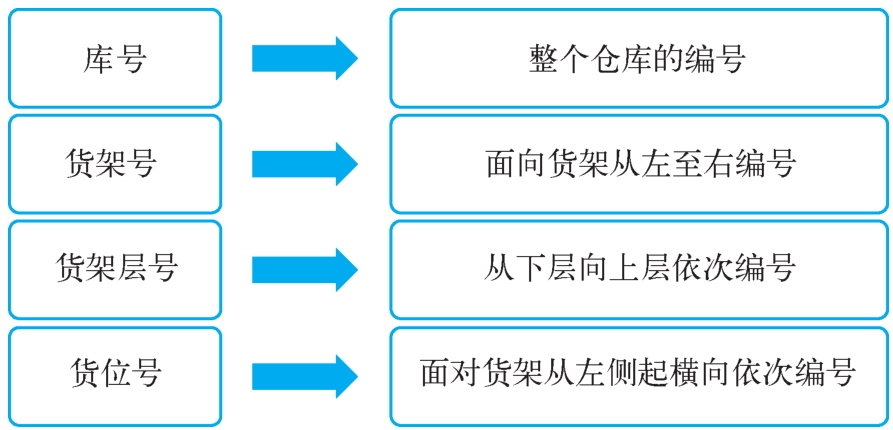 四号定位法,即库号-货架号-货架层号-货位号,编码规则如图2-16所示。
