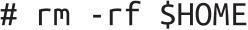( rm 命令并不会像刚才那个有bug的软件一样按字面意思来理解 $HOME 这几个字符,而是会把它解读成当前这位用户的home目录,由于这是一个标准的UNIX系统,因此root用户的home目录是 / ,也就是根目录。这意味着,这条命令会把根目录以及它下面各级子目录中的所有内容全都删掉。)