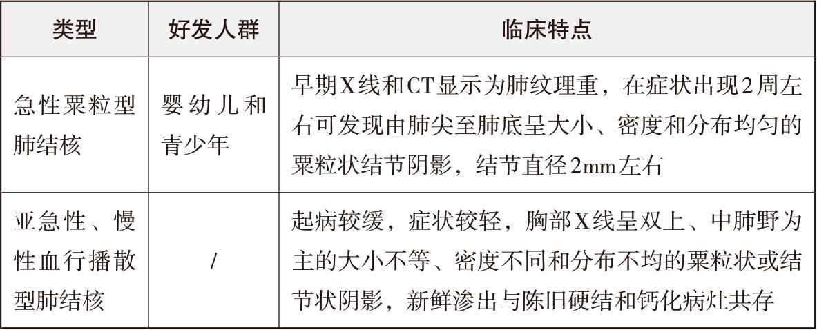 (1)原发型肺结核:好发于少年儿童,临床特点为无症状或症状轻,多有结核病家庭接触史,结核菌素试验多为强阳性,胸部X线表现为哑铃型阴影,即原发病灶、引流淋巴管炎和肿大的肺门淋巴结,形成典型的原发综合征。