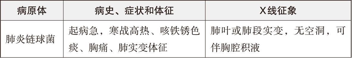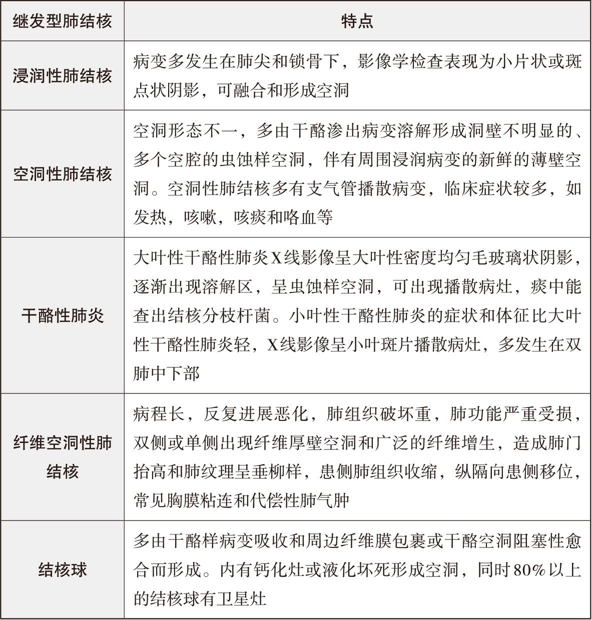 (3)继发型肺结核:含浸润性肺结核、空洞性肺结核、干酪性肺炎、纤维空洞性肺结核和结核球。见表1-13。