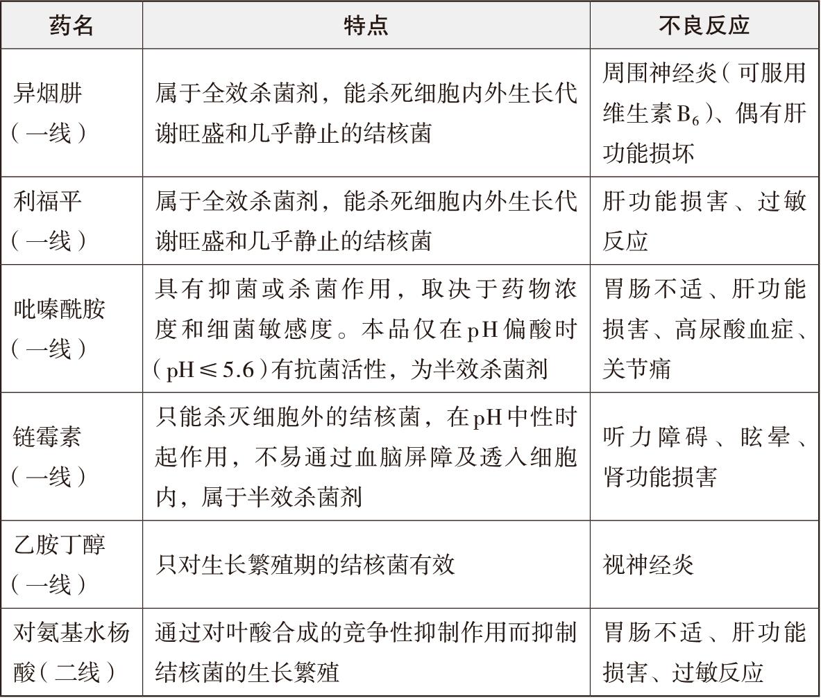 常用抗结核药物:肺结核的治疗以化学治疗为主,其原则为早期、规律、全程、适量、联合。化学治疗包括杀菌作用、防止耐药菌产生和灭菌,可以具体根据不同的分枝杆菌选择相应抗生素,最佳服用方法为顿服。常用抗结核药物见表1-14。