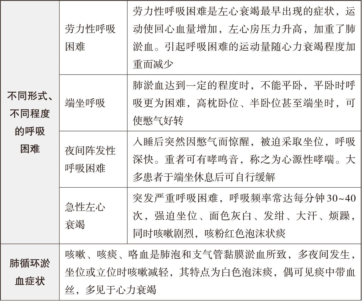 1.症状 突发严重呼吸困难,呼吸频率常达30~50次/分,强迫坐位、面色灰白、发绀、大汗、烦躁、同时频繁咳嗽,咳粉红色泡沫状痰,极重者可因脑缺氧而致神志模糊。听诊时两肺满布湿性啰音和哮鸣音,心尖部第一心音减弱,心率快,同时有舒张早期第三心音奔马律,肺动脉瓣第二心音亢进。