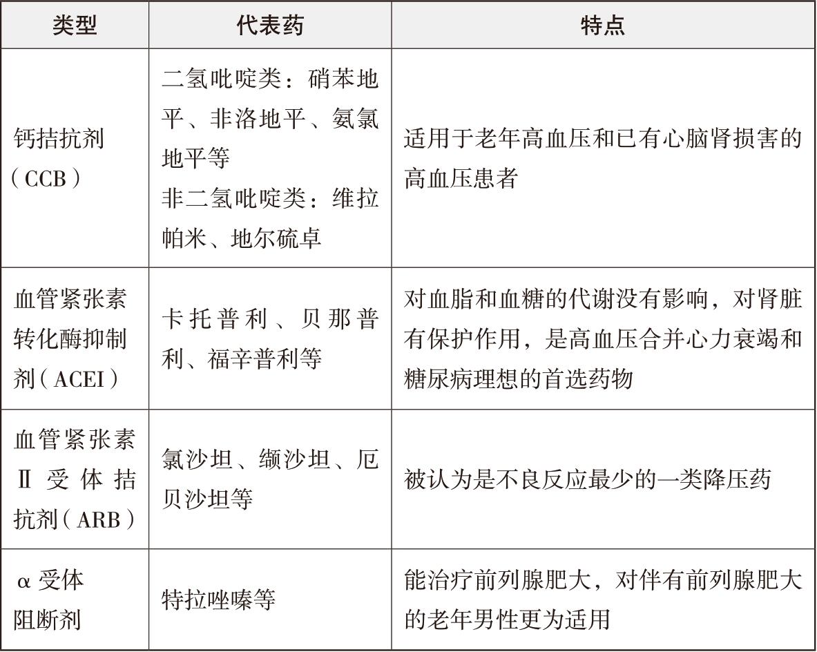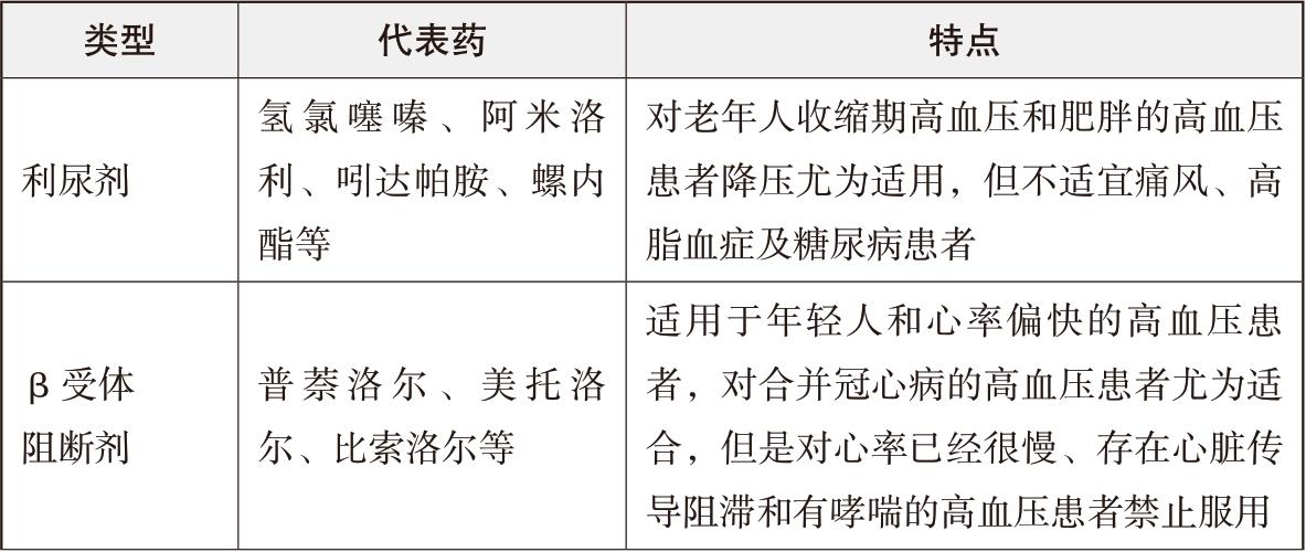 3.合理使用降压药 目前常用降压药物可归纳为五类,即利尿剂、β受体阻断剂、钙通道阻断剂(CCB)、血管紧张素转换酶抑制剂(ACEI)和血管紧张素Ⅱ受体拮抗剂(ARB)。单药治疗应从小剂量开始,逐步递增剂量。联合治疗有利于血压在相对较短的时间内达到目标值,也有利于减少不良反应。