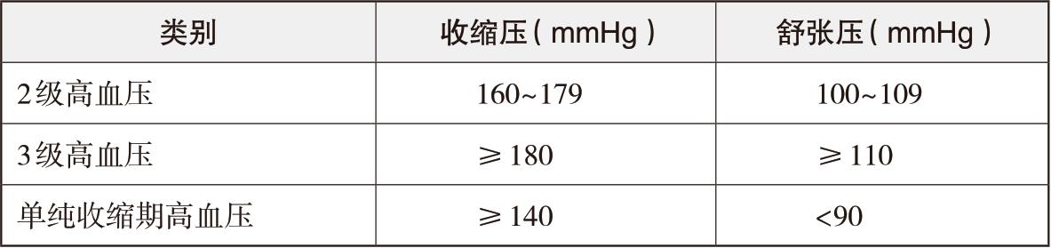 未使用降压药物的情况下,非同日3次测量诊室血压,收缩压(SBP)≥140mmHg和/或舒张压(DBP)≥90mmHg。根据血压升高水平,又进一步将高血压分为1~3级。当收缩压和舒张压分属于不同分级时,以较高的级别作为标准。见表2-7。