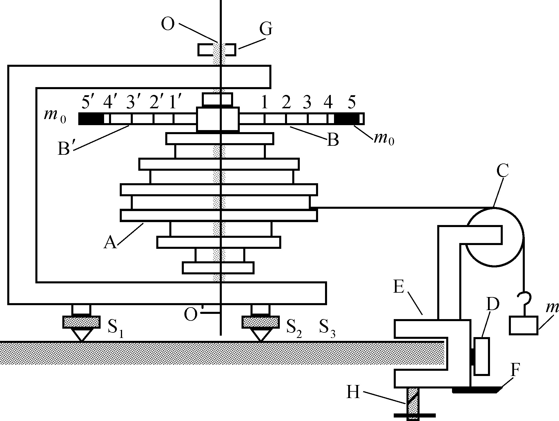刚体转动实验装置如图2-1所示。图中A是一个具有不同半径 r 的塔轮,可使相同绳张力作用产生不同的外力矩。塔轮两边对称地伸出两根有等分刻度的均匀细杆B和B',B和B'上各有一个可以移动的圆柱形重物 m 0 ,用以观测转动惯量随质量分布的变化规律以及验证平行轴定理。它们一起组成一个可绕固定轴OO'转动的刚体系。塔轮上绕一细绳,通过滑轮C与砝码 m 相连,当砝码下落时通过细绳对刚体施加外力矩。滑轮C的支架可以借固定螺丝D而升降,以保证细绳绕塔轮不同的半径转动时均可保持与转轴相垂直。滑轮台架E上有一个标识F用来判断砝码m的起始位置。H是有固定台架的螺旋扳手。取下塔轮,换上铅直准钉,通过底脚螺丝S 1 、S 2 、S 3 可以调节OO'竖直。调好OO'轴线竖直后,再装上塔轮,转动合适后用固定螺丝G固定。