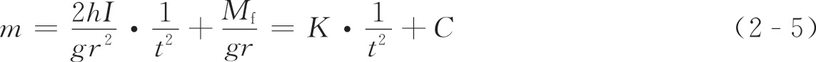 若保持 r 、 h 及重物 m 0 的位置不变,改变砝码 m 的大小,则相应的下落时间 t 发生改变,则由式(2-4)有