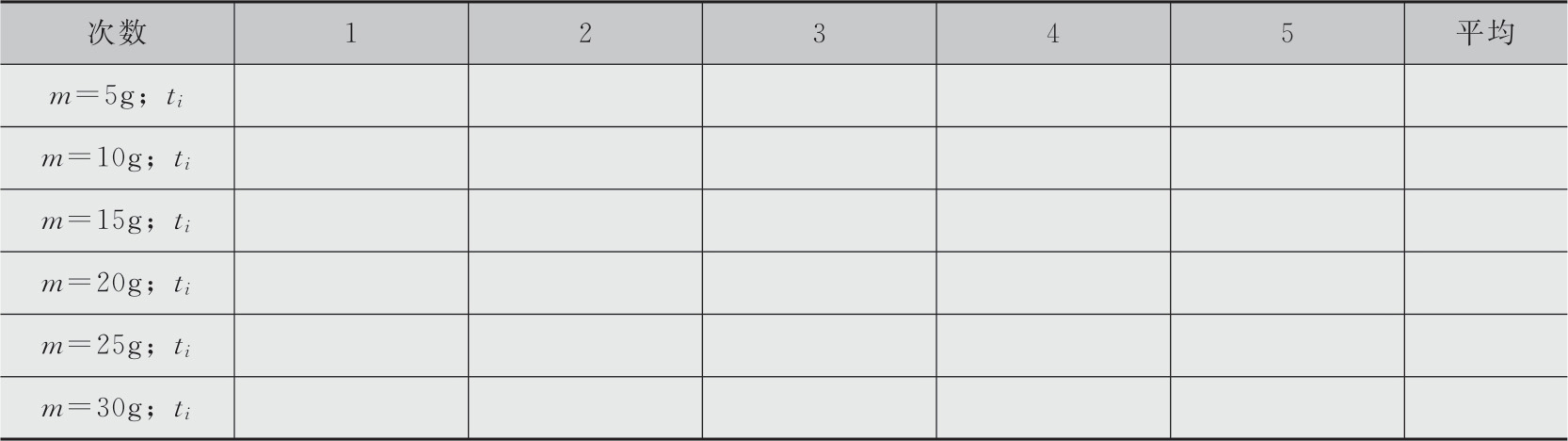 4.然后改变 m 值,至少6次,每次增加5.00g砝码,用同样的方法测出相应 m i 值、下落的时间 t i 。记录在表2-2中。
