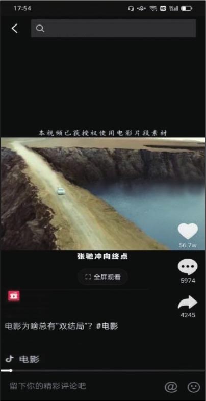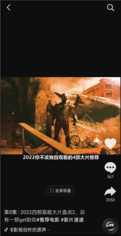 图1-11所示为抖音一电影解说账号推出的一期影评,其解说带有讽刺和搞笑的元素,个人风格十分鲜明,很容易引起观众的兴趣。图1-12所示为抖音某博主推出的一期电影盘点视频,该博主通过制作不同专题的短视频来满足不同用户的需求,每个专题都选择了大量的同类影片进行盘点。