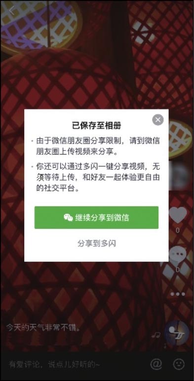 这里以分享到微信朋友圈为例,在图1-16所示的分享界面中点击“朋友圈”按钮,短视频将会自动保存至本地相册,完成后会弹出提示框,如图1-17所示。