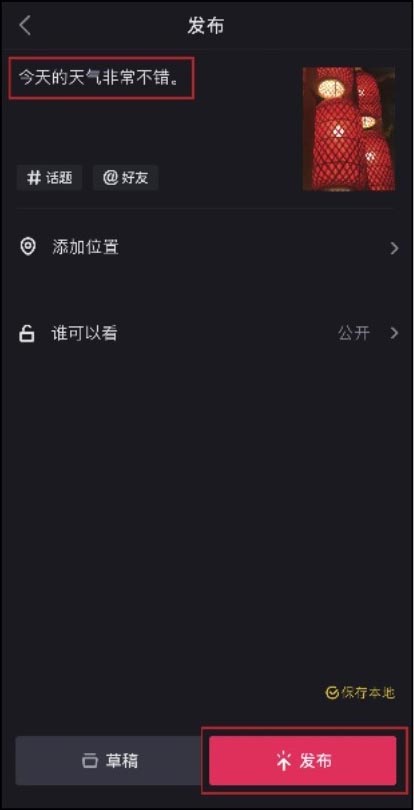 短视频的上传和发布渠道众多,操作也比较简单。如果是手机拍摄的短视频,那么上传和发布就更加便捷简单。以在抖音发布短视频为例,剪辑完成后,会进入视频“发布”界面,在该界面中可以输入与短视频内容相关的文案,或添加话题、提醒好友,以吸引更多人观看,设置完成后点击“发布”按钮即可上传发布,如图1-14所示。