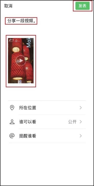 进入微信朋友圈,将保存至本地的视频上传,完成视频上传后,短视频创作者可在动态发布界面输入文字或提醒好友查看,最后点击界面右上角的“发表”按钮即可,如图1-17所示。