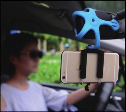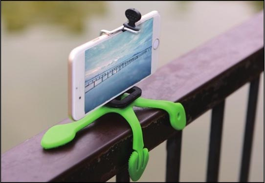 在常规的拍摄支架和三脚架的基础上,甚至衍生出了一些创意工具,如壁虎支架。这类支架除了继承了普通拍摄支架的稳定性之外,其特殊的材质使其能随意变化形态,因此可以攀附固定在诸如汽车后视镜、栏杆等物件上,如图2-8和图2-9所示,从而让拍摄者获得独特的镜头视角。
