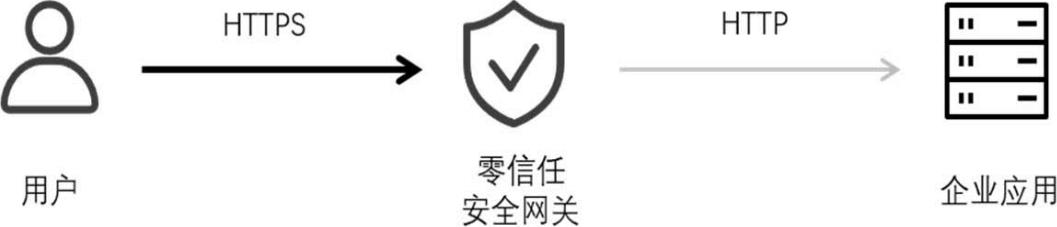 零信任客户端与零信任安全网关之间通常使用HTTPS进行通信,也有些企业的业务系统希望使用HTTP进行通信。因此,零信任安全网关应该支持SSL卸载,安全网关对前半段和后半段分别使用不同的协议进行传输,用户与网关之间使用网关颁发的证书进行通信,如图4-21所示。