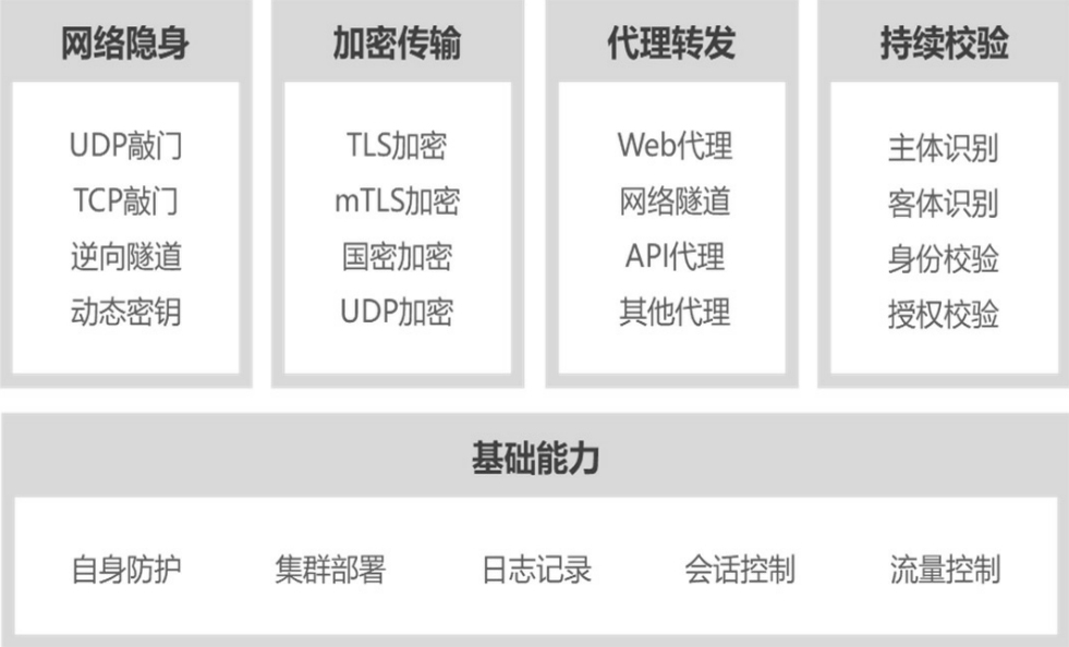 零信任安全网关通常会部署在企业网络的入口,对企业影响非常大。因此,是否支持各种协议、是否支持高可用,以及加密通信的性能和稳定性,是零信任安全网关最重要的评价指标。上文已经介绍了零信任安全网关的组件和原理,下面将对零信任安全网关需要具备的能力进行总结,如图4-24所示。