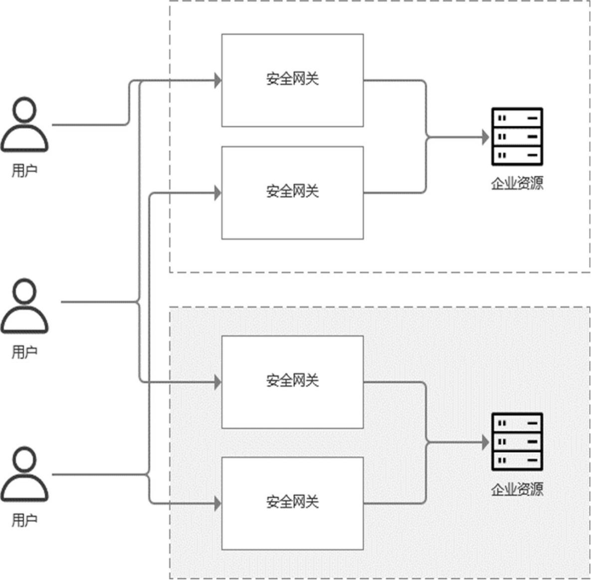 用户与资源处于不同的网络中,用户想获取资源,只能通过安全网关进入业务系统,安全网关就像门卫,放行合法的,拦住不合法的。用户不能直接接触业务系统,必须先经过安全网关的认证才能与业务系统连接。