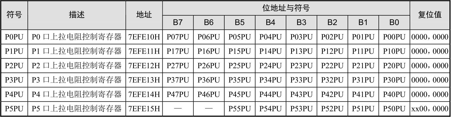 STC32G12K128单片机所有的I/O端口内部均可使能一个下拉电阻,由寄存器P n PD( n =0~7)来控制,如P1.7是否使能下拉电阻就由P1PD.7来控制,“0”禁止,“1”使能。