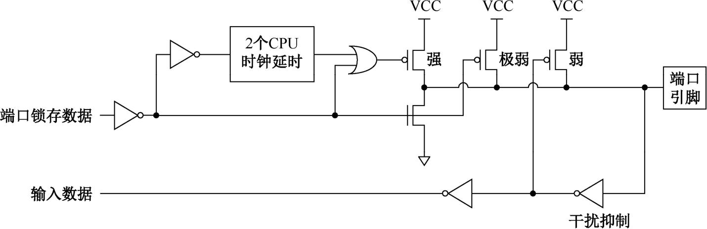 第3个上拉晶体管称为“强上拉”晶体管,当端口锁存数据由0到1跳变时,“强上拉”晶体管用来加快准双向端口由低电平到高电平的转换。当发生这种情况时,“强上拉”晶体管导通约2个时钟周期,以迅速上拉高电平。