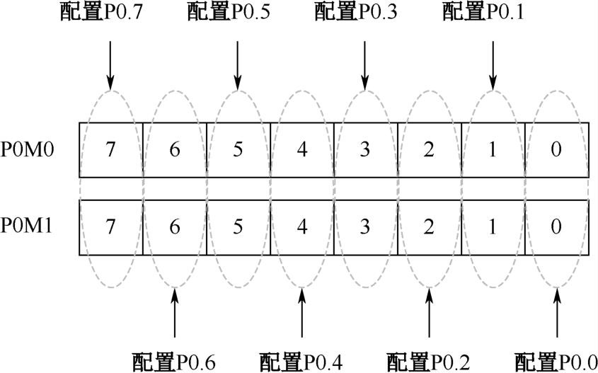 每个I/O端口的工作模式都需要使用两个寄存器进行设置,P n 端口就由P n M1和P n M0来进行设置,其中 n =0~7。以P0口为例,设置P0口需要通过P0M1和P0M0两个寄存器进行,设置关系如图3.10所示,P0M1.7和P0M0.7用于设置P0.7的工作模式。STC32G12K128单片机I/O端口工作模式的设置如表3.25所示。