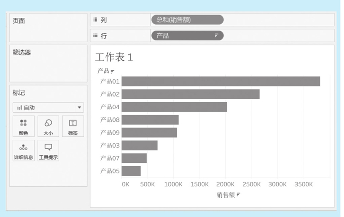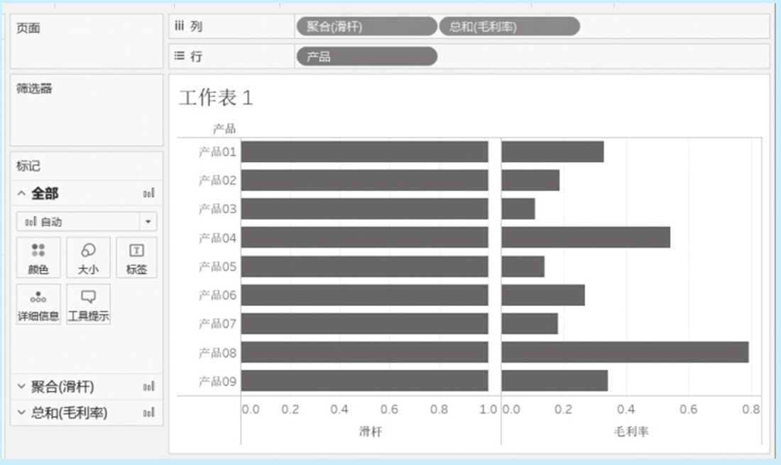 将字段“滑杆”和“毛利率”拖至列区域(注意滑杆在前,毛利率在后),将字段“产品”拖至行区域,得到基本条形图,如图1-52所示。