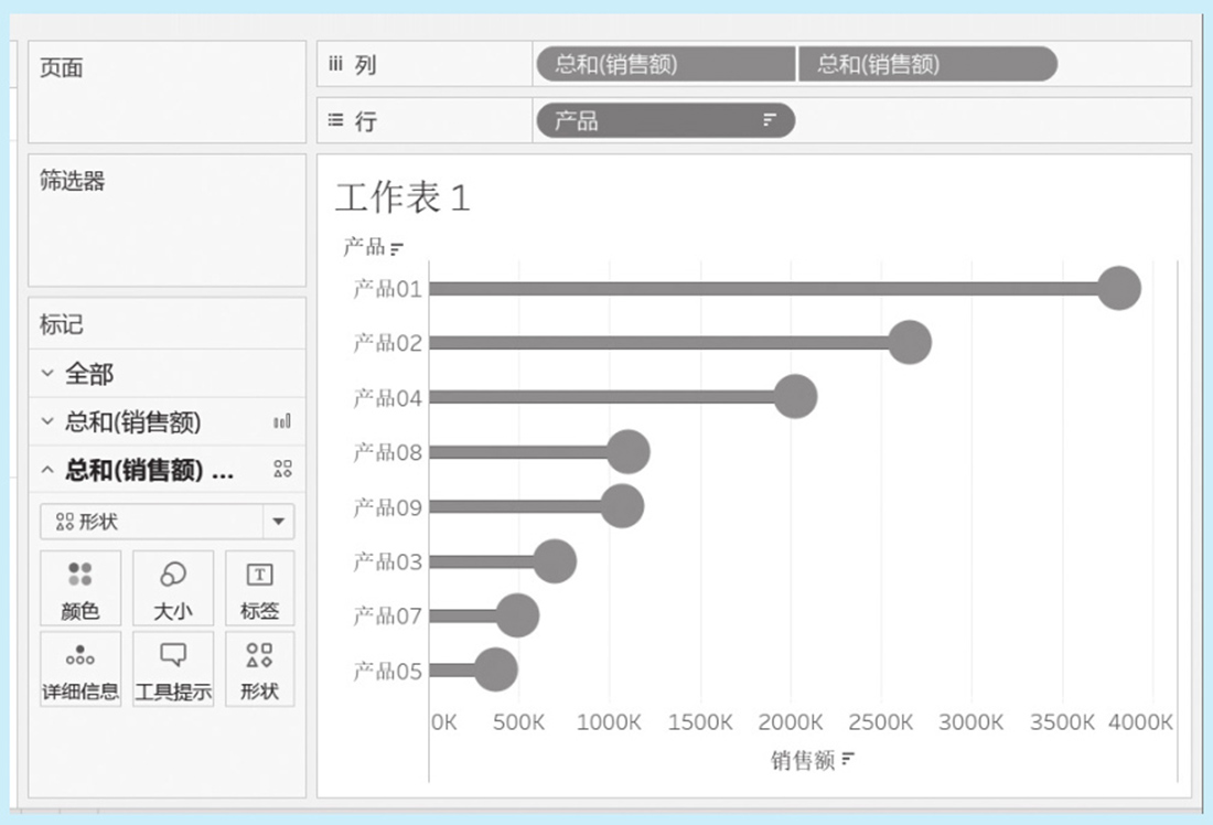 这种条形图也是一种组合图,特点是一根直线的前端是圆形,形似棒棒糖,故称“棒棒糖条形图”,如图1-49所示。其制作方法与圆顶条形图是一样的,只不过是将第二个销售额的标记类型设置为“圆”或“形状”,然后分别设置两个销售额标记的大小。请读者自己练习。