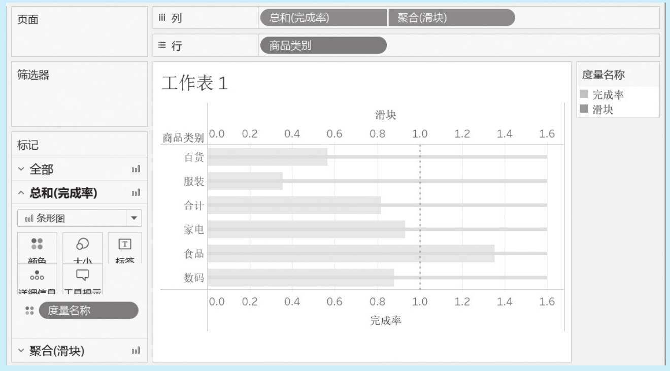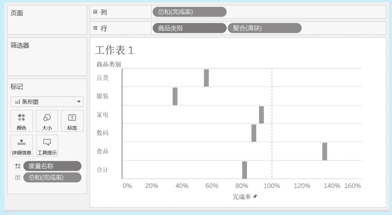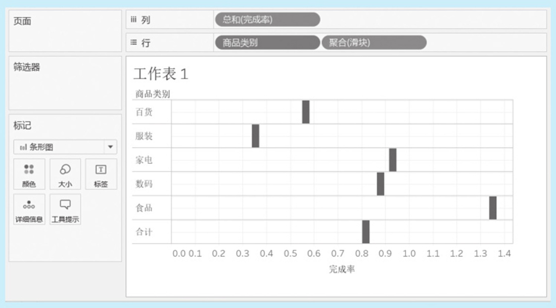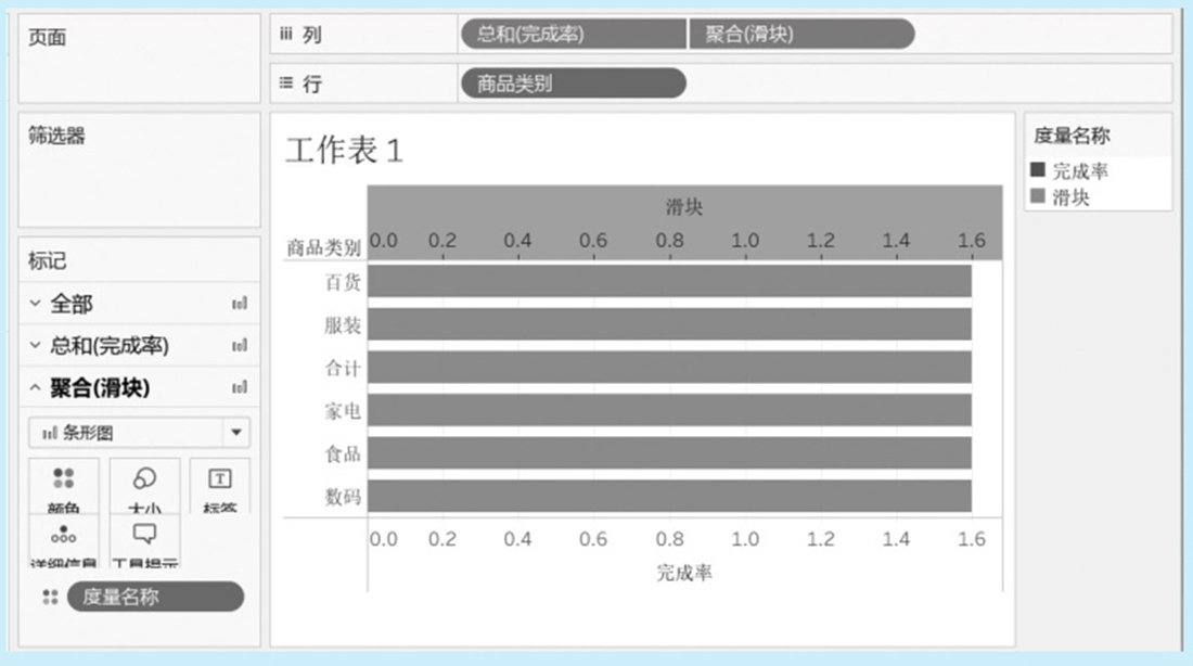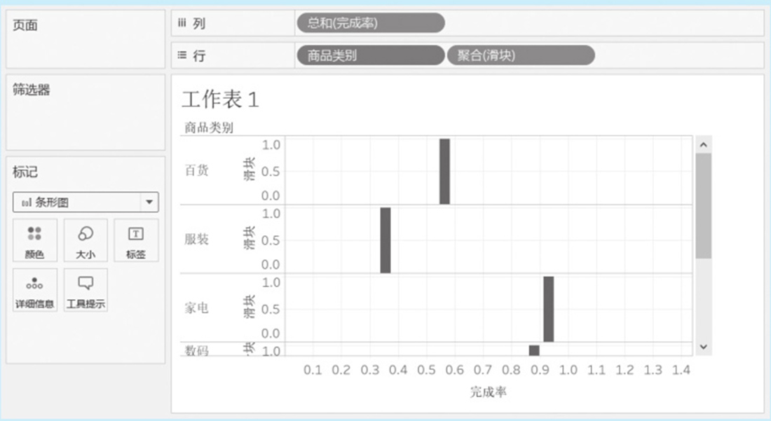 然后将字段“完成率”拖放至列区域,将字段“商品类别”和“滑块”拖放至行区域,然后将默认的“圆”改为“条形图”,得到基本条形图,如图1-63所示。