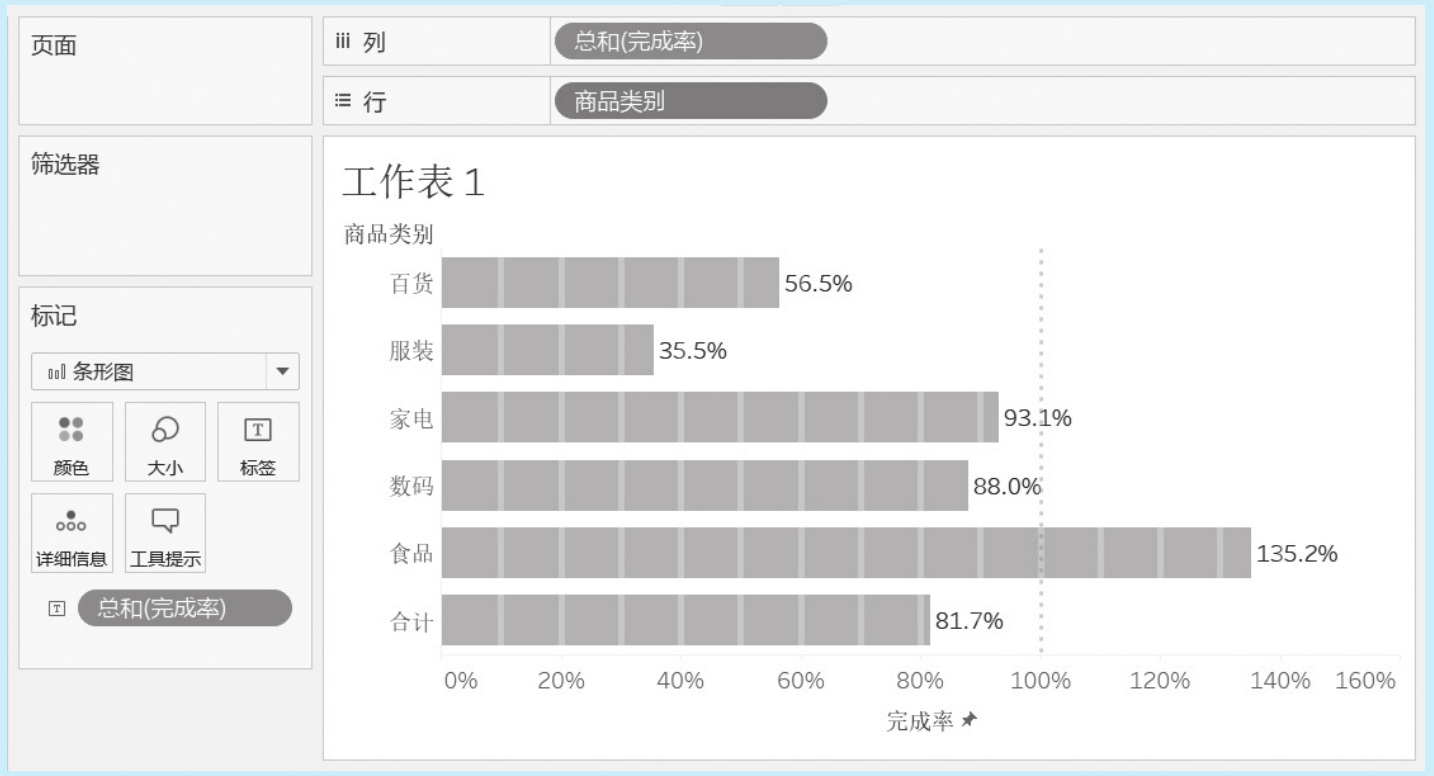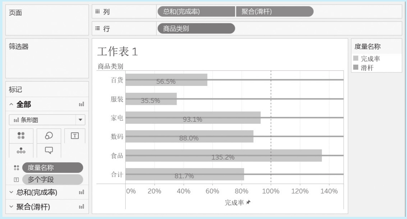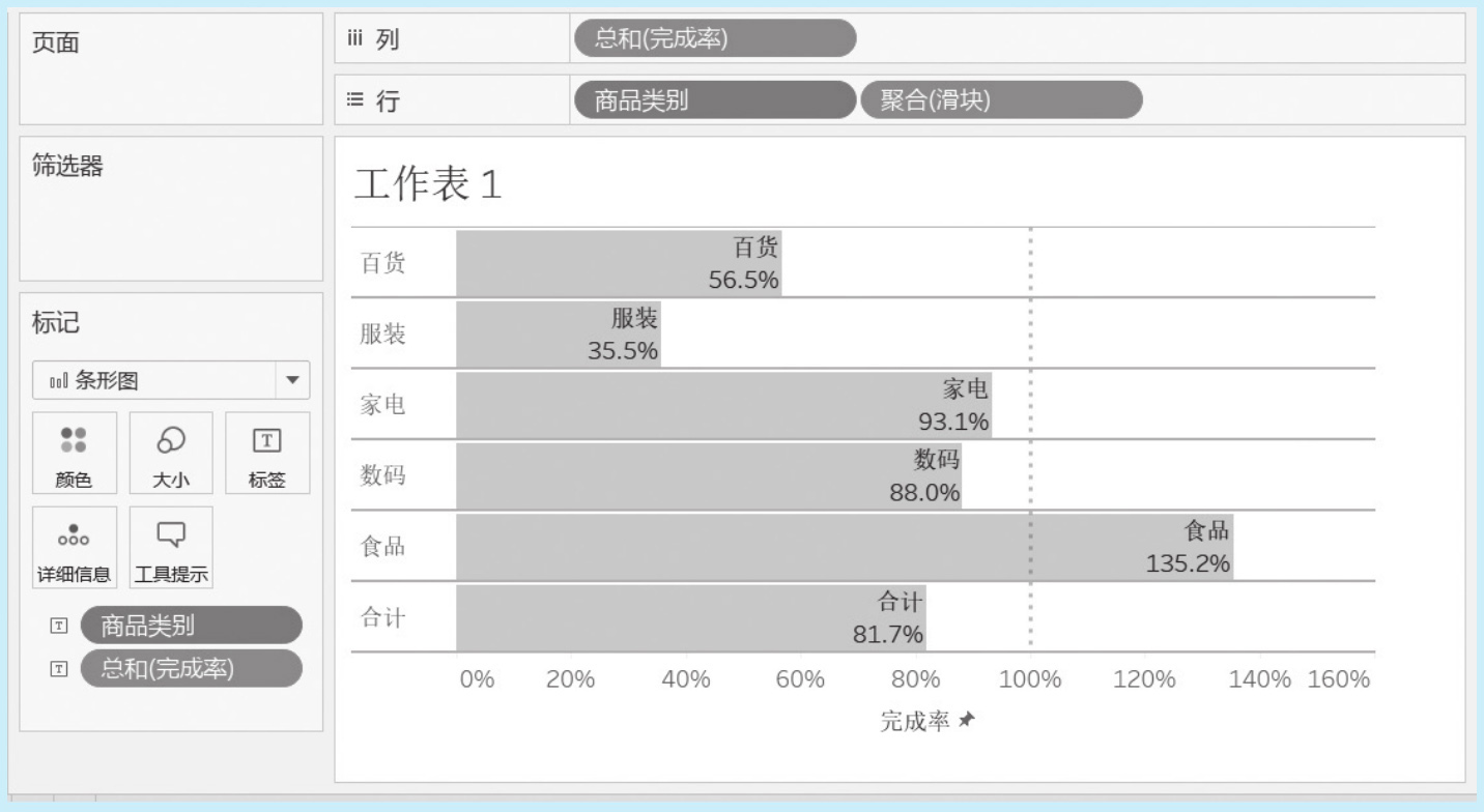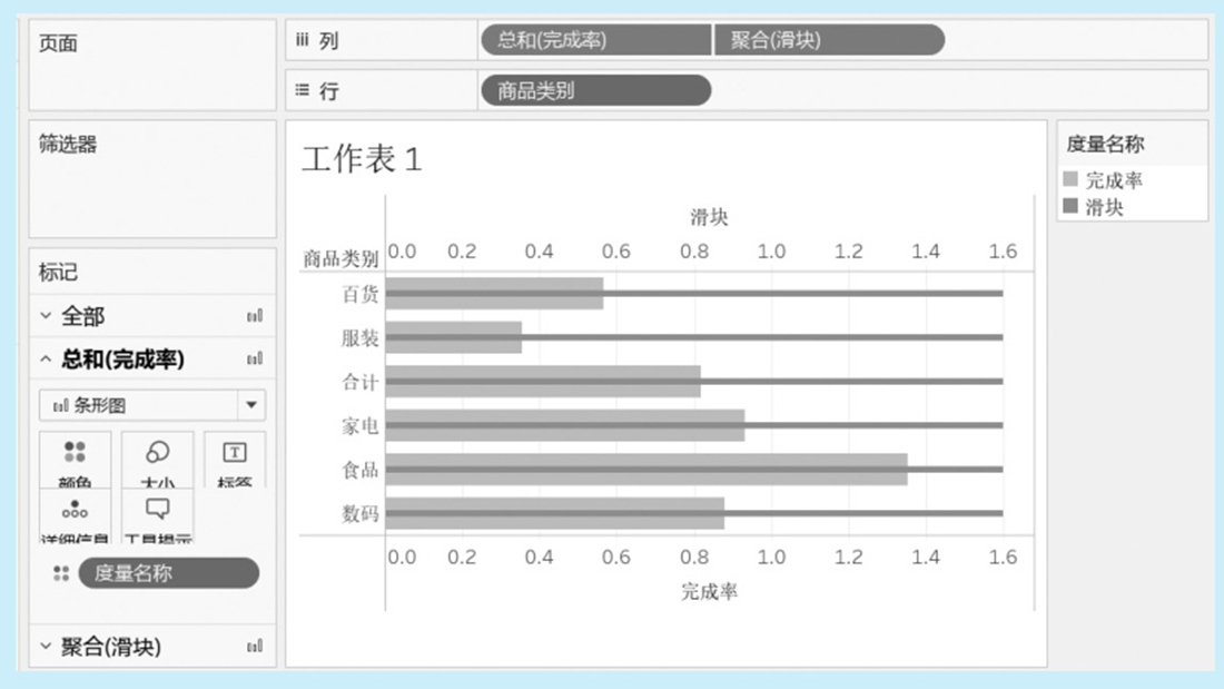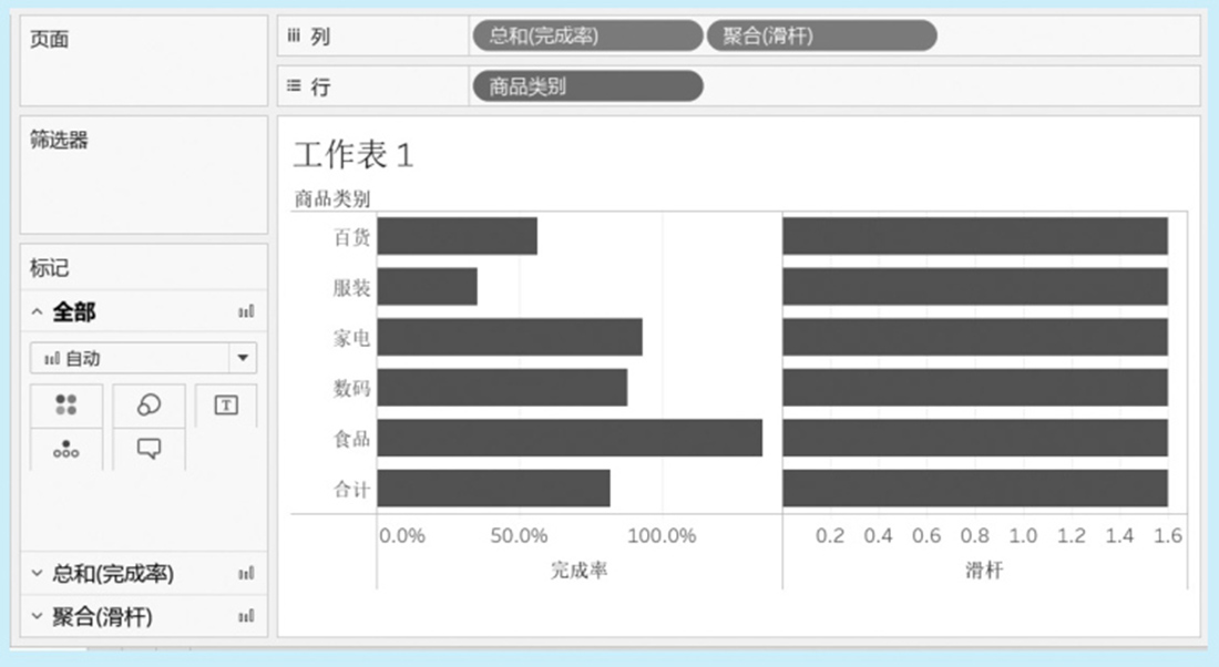 然后将字段“完成率”拖放至列区域,将字段“商品类别”和“滑块”拖放至行区域,然后将默认的“圆”改为“条形图”,得到基本条形图,如图1-63所示。
