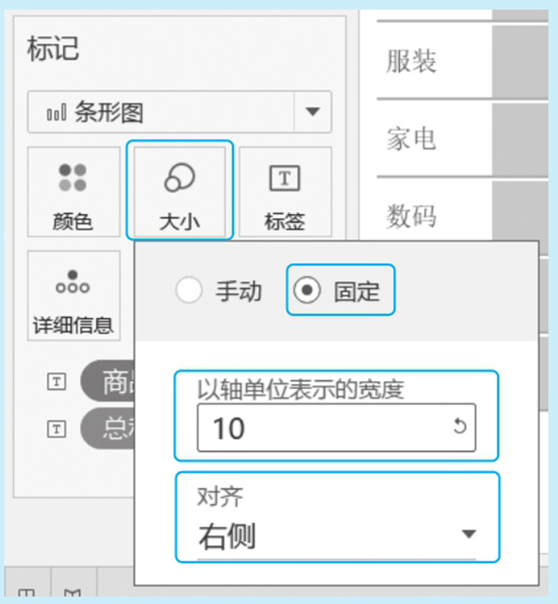 这个图表的制作方法与滑块效果的进度条形图基本一样,唯一不同的是设置滑块大小:选择“固定”大小,输入宽度“10”,对齐选择“右侧”,如图1-66所示。