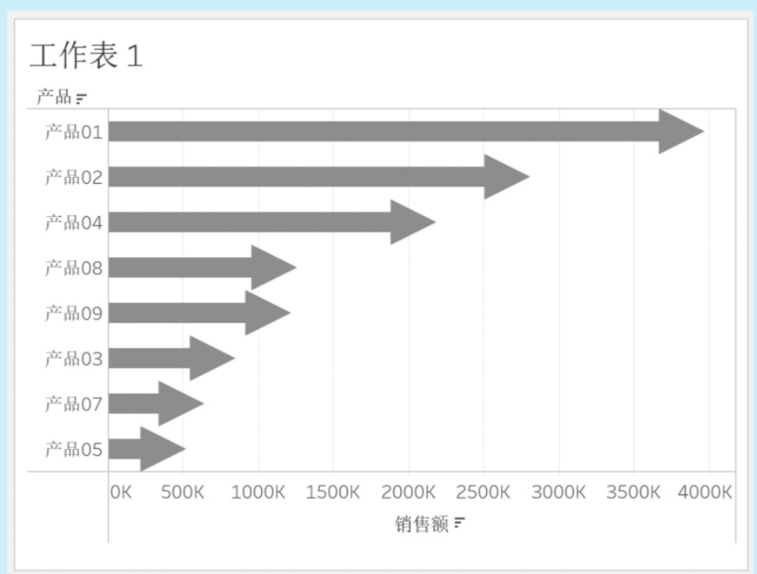 箭头条形图的效果如图1-46所示,其制作方法与圆顶条形图是一样的,只不过是将第二个销售额的标记类型设置为“形状”里的右箭头。不过,要注意分别调整条形和形状的大小,使两者匹配。