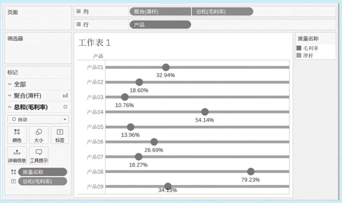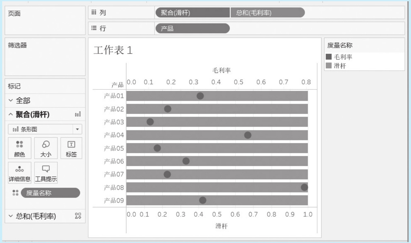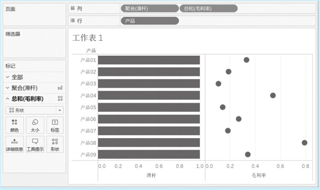 将“毛利率”设置为“双轴”,并同步轴,然后重新将“滑杆”标记类型设置为条形,如图1-54所示。