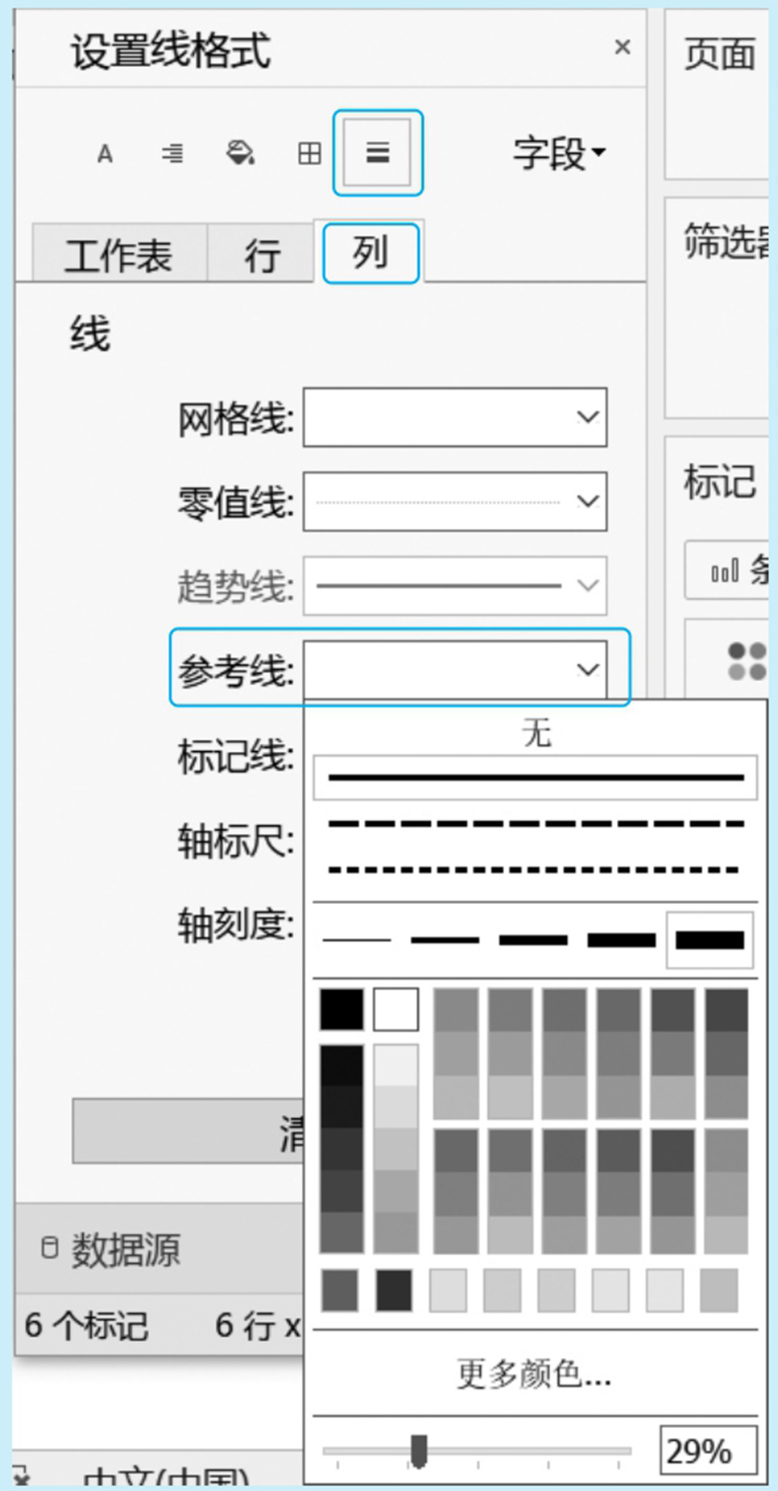首先制作基本条形图,然后添加常量参考线,这个例子是完成率进度,我们可以分别添加0.2、0.4、0.6、…、1.4几个常量参考线,如图1-69和图1-70所示。