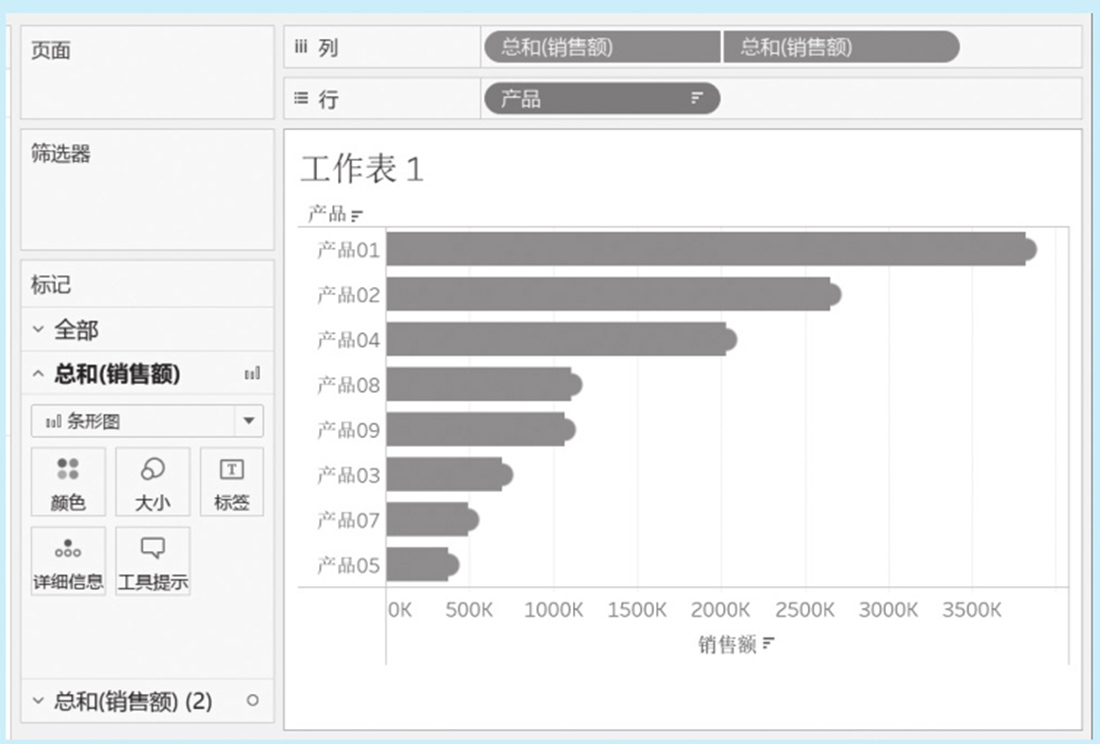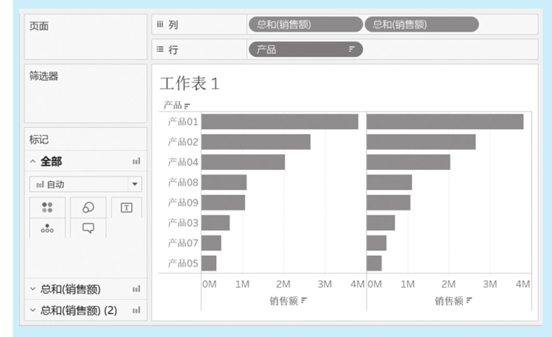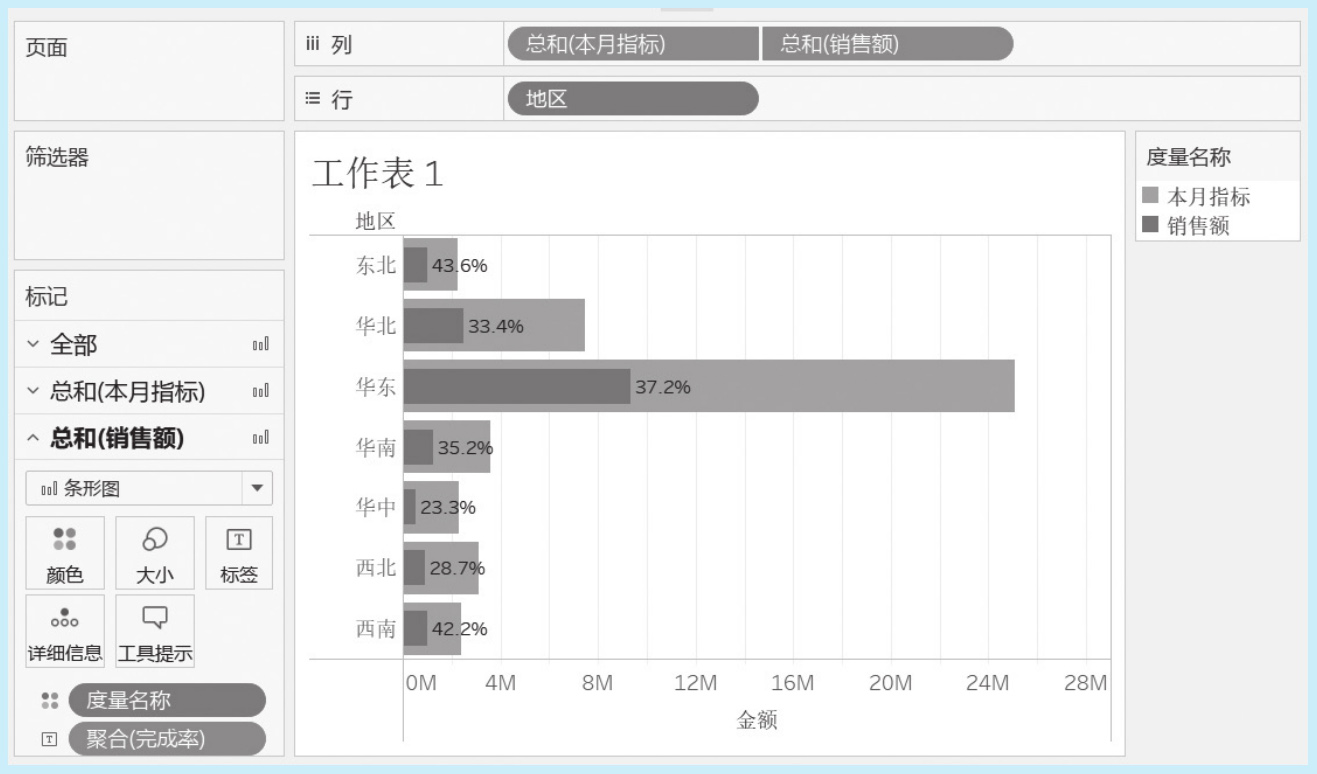 将第二个销售额设置为双轴,并同步轴,不显示次坐标轴,同时将第一个销售额的标记类型设置“条形”,第二个销售额的标记类型设置为“圆”,如图1-45所示。