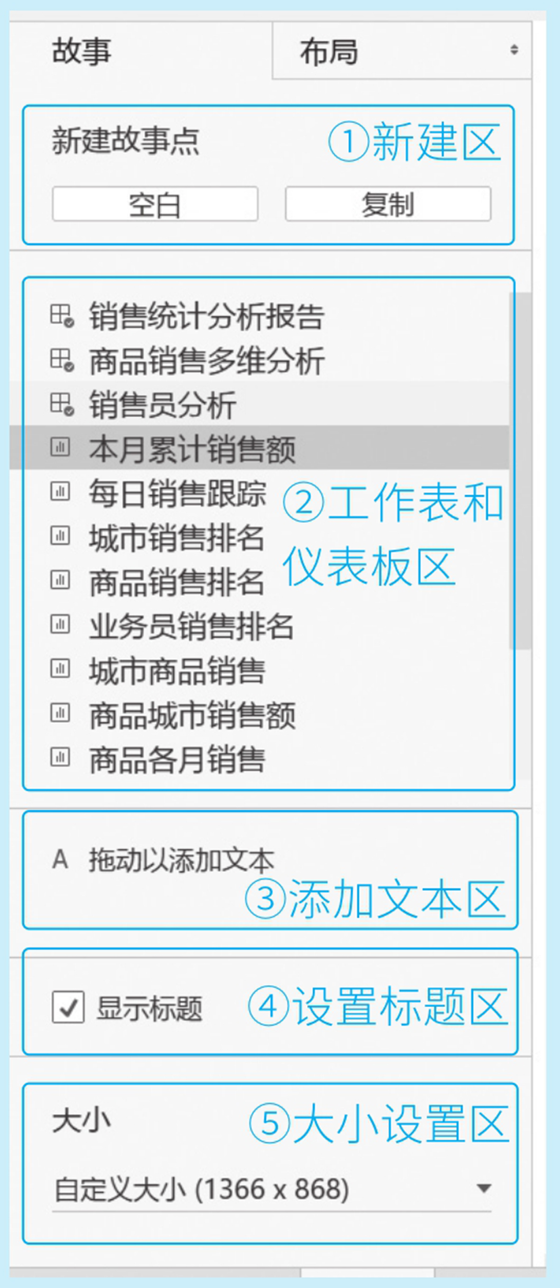 故事展示区显示的是指定工作表或仪表板,每个故事只能放置一个工作表或一个仪表板,通过建立几个故事点来分别展示这些分析结果。