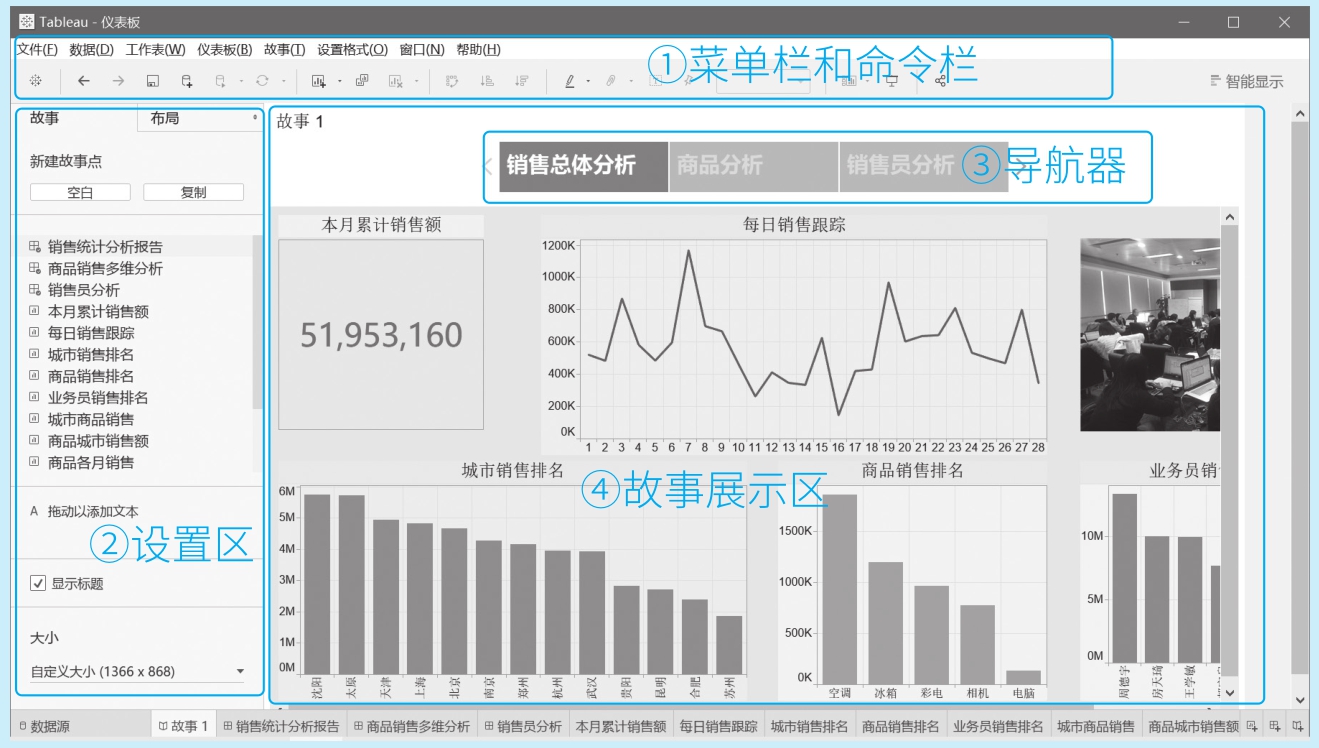 由于每个工作表一般是一个分析点,一个仪表板也由于版面限制只能放少数几个工作表,因此我们可以使用故事来把这些工作表或仪表板串起来,通过切换展示每个工作表或仪表板的分析视图,来逐步阐述分析过程和结论。