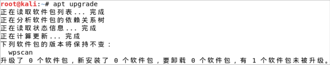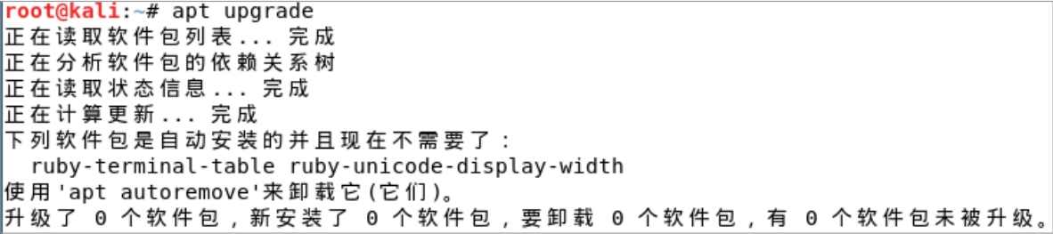 最后,再次运行apt upgrade命令,如果显示无软件需要更新,此时系统更新完成,如图2-55所示。