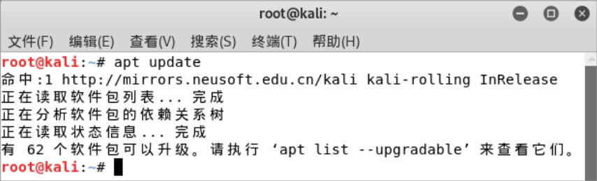 Step02 打开Kali Linux的终端设置界面,在其中输入命令apt update,然后按Enter键,即可获取需要更新软件的列表,如图2-49所示。