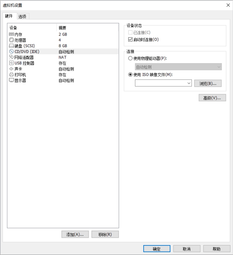 Step01 打开安装好的虚拟机,单击CD/DVD选项,如图2-34所示。