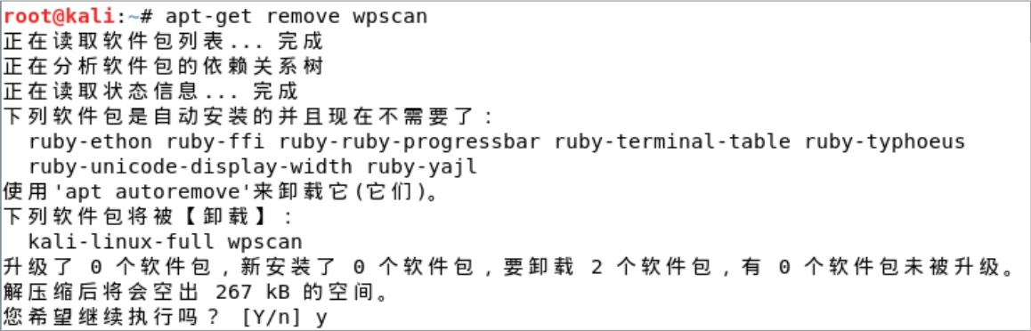 注意:由于网络原因可能需要多执行几次更新命令,直至更新完成。另外,如果个别软件已经安装存在升级版本问题,如图2-52所示,这时可以先卸载旧版本。运行“apt-get remove <软件名>”命令,如图2-53所示,此时按Y键即可卸载旧版本。