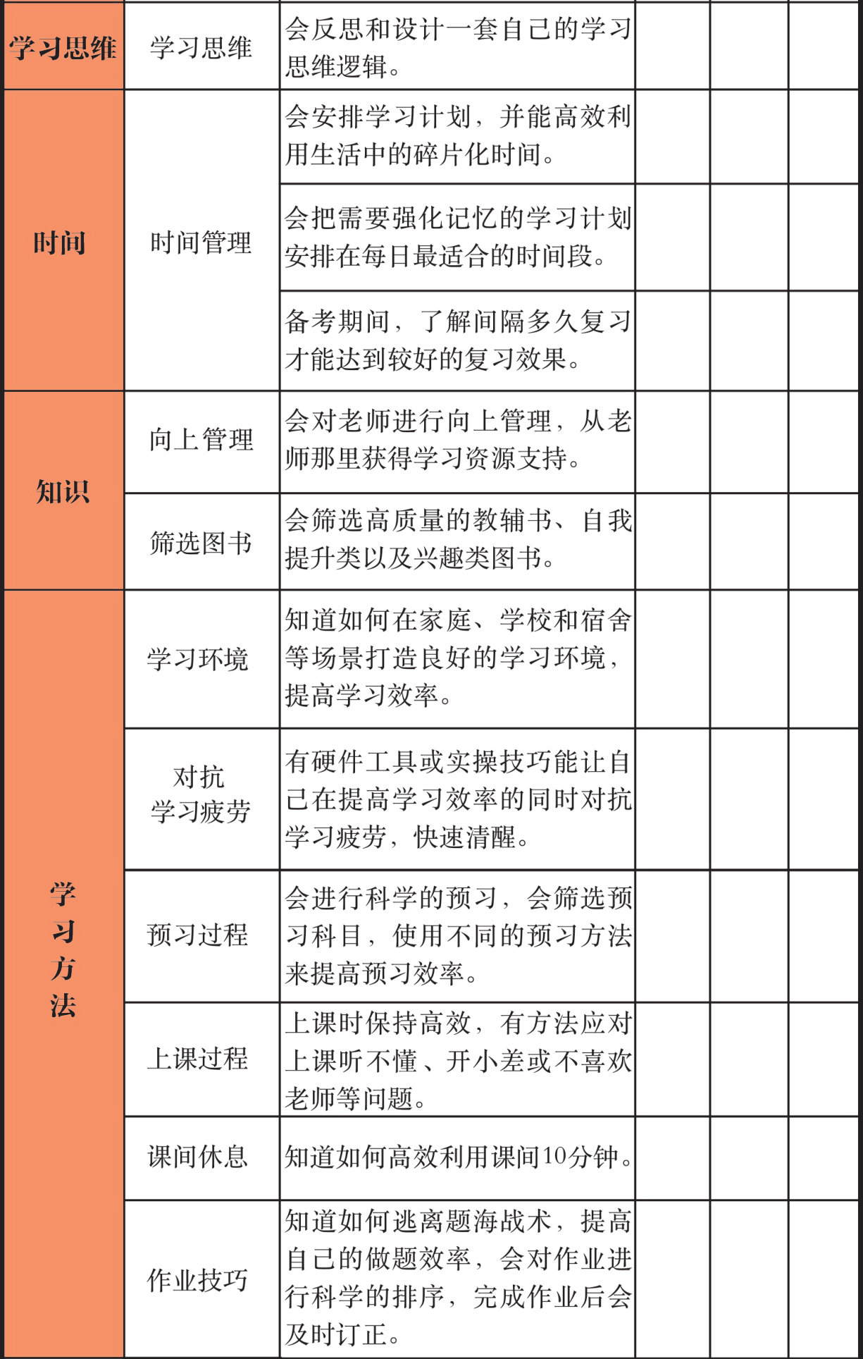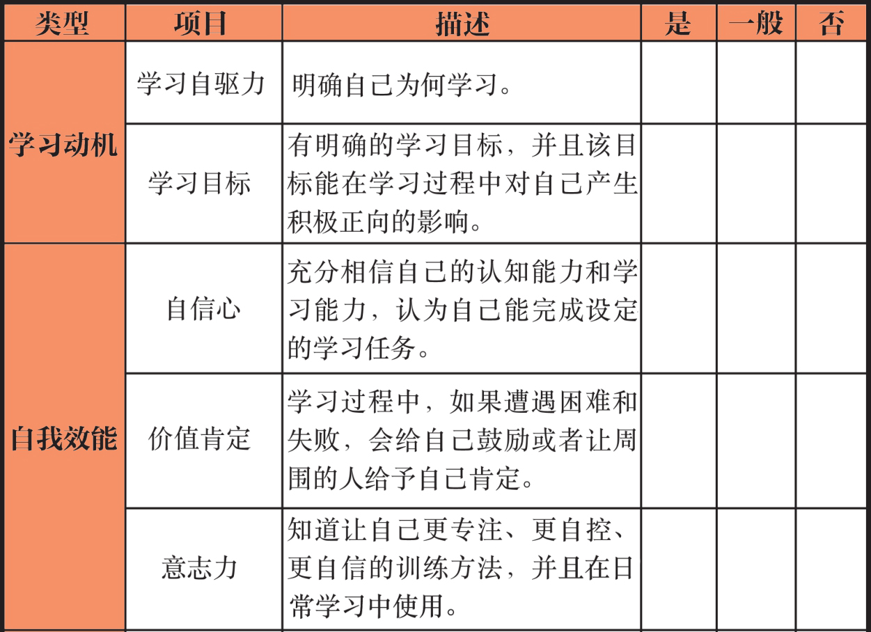 如果你觉得自己的学习过程非常困难或痛苦,抑或是学习效果总是不尽如人意,那么你需要从内在原因和外部环境两个层面对自己的学习过程进行自纠自查。还是那句老话:“想成功,先了解自己因何失败。”找到了问题所在,问题就解决了一半。接下来,你可以按照下表进行自纠自查,了解学习过程中自己的薄弱环节,再针对性地改进和调整。