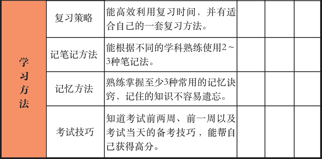 想要获得良好学习效果的前提是,你在上述的关键环节都有一定的技巧。针对学习的关键环节,本书梳理了一套方法指南。对于你标注“一般”或“否”的环节,可以参考本书的方法,再加上刻意训练,就能产生好的学习效果。