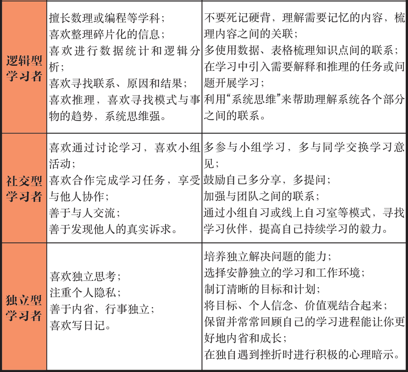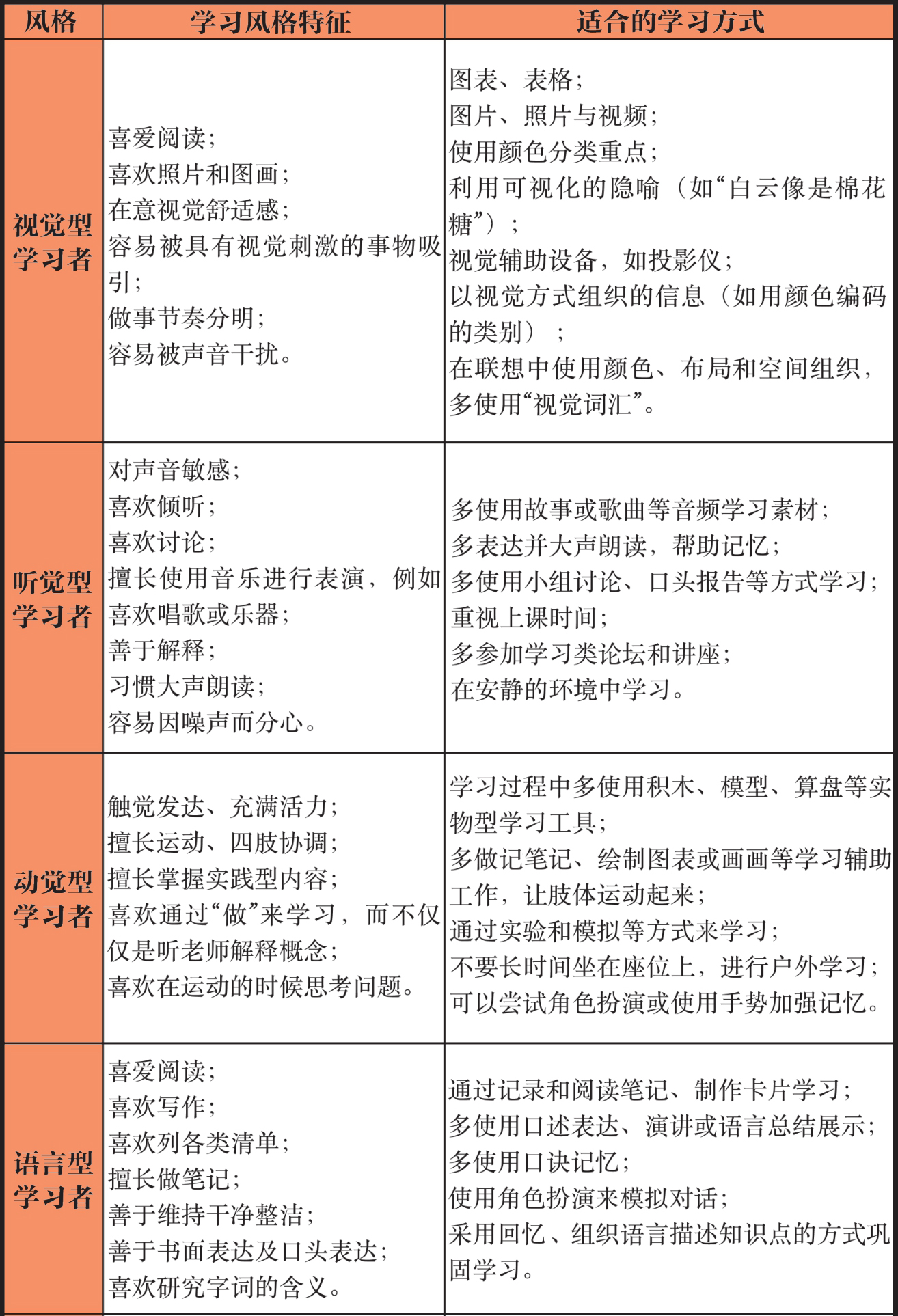 学习风格特征对照表