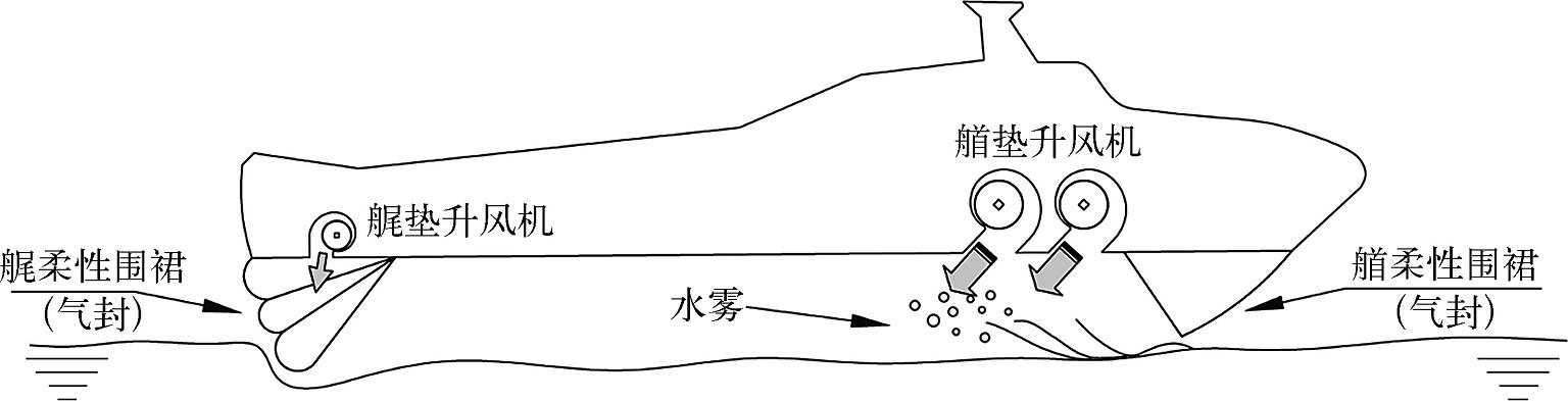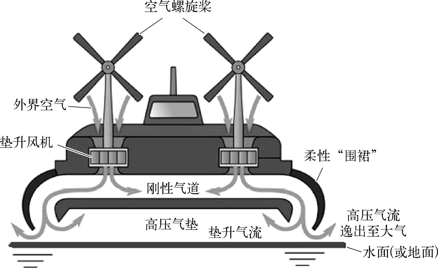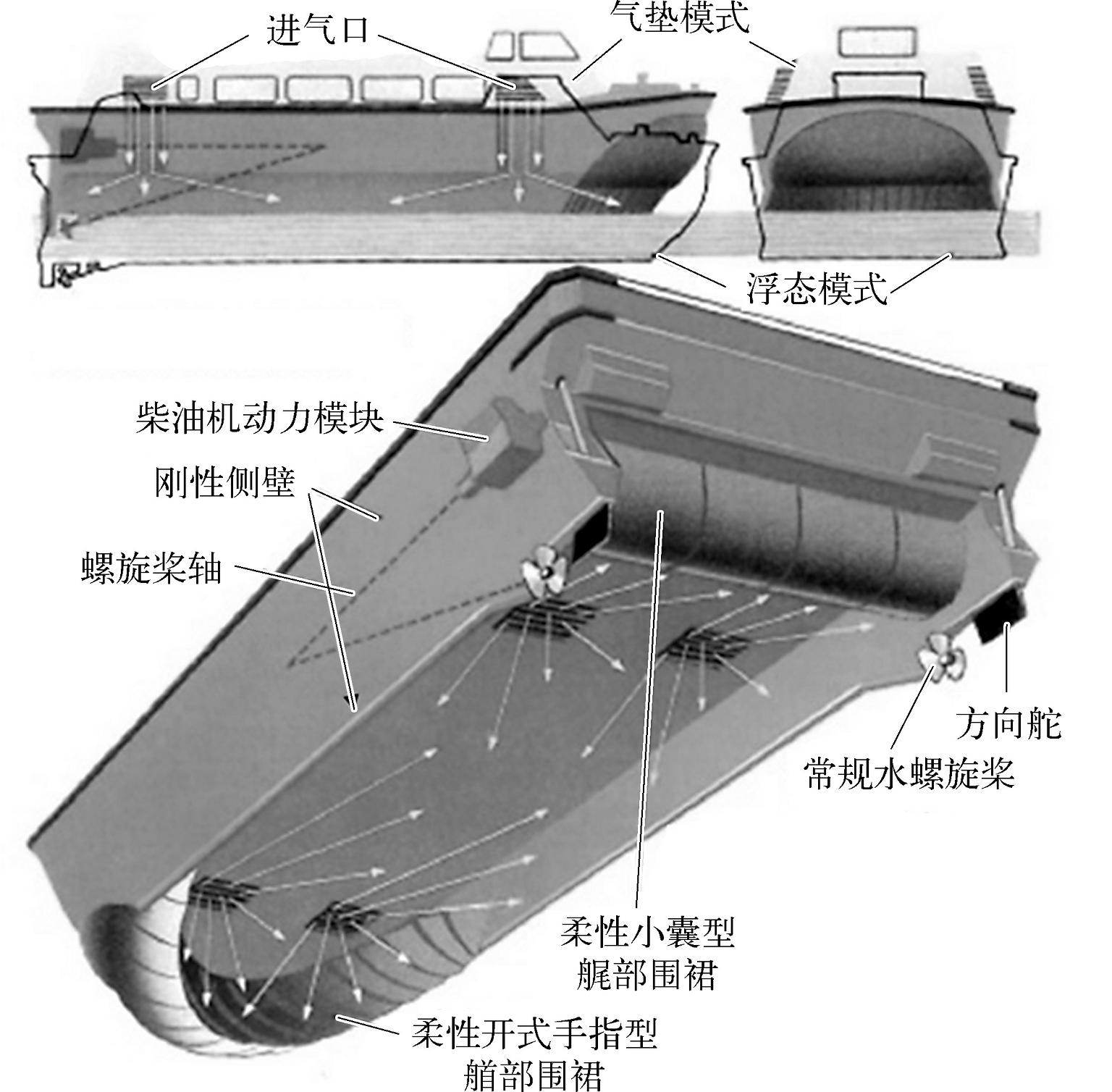 全垫升气垫船在船体四周下部与船底装有用橡胶涂覆骨架的织物等柔性材料制成的围裙,利用垫升风机将空气加压后注入围裙内,在围裙与船底、水面或地面一起形成围蔽的空间内产生气垫升力,将船体全部托起,仅围裙下部的一圈手指与水面或地面柔性接触,并由高置的空气螺旋桨或喷气装置推进,具有优良的两栖性、快速性和越障能力(见图1.2)。