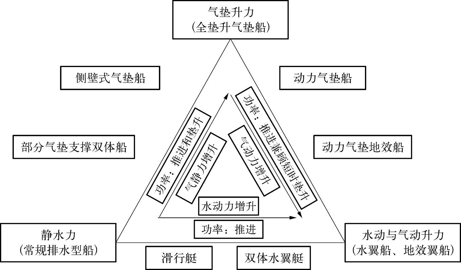 图1.1 静水力、气动力、水动力举升三角形及高性能船分类关系