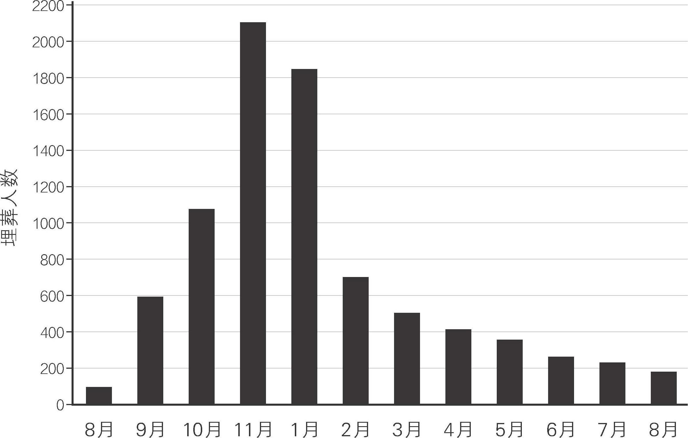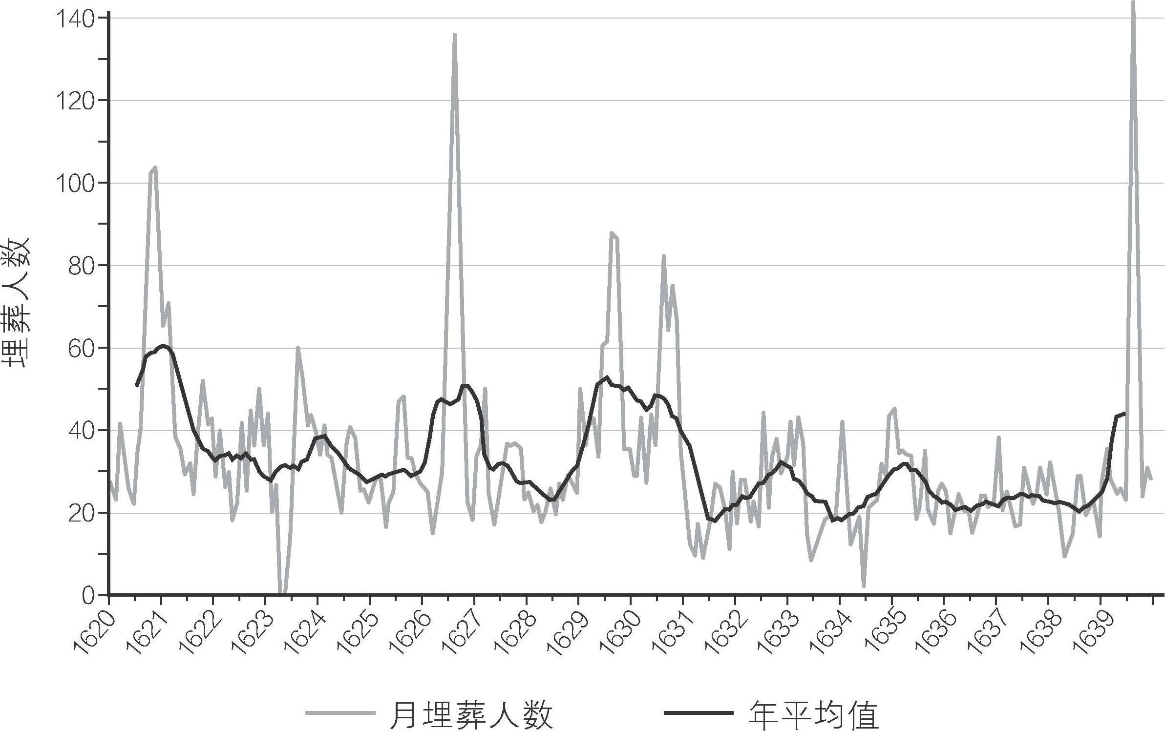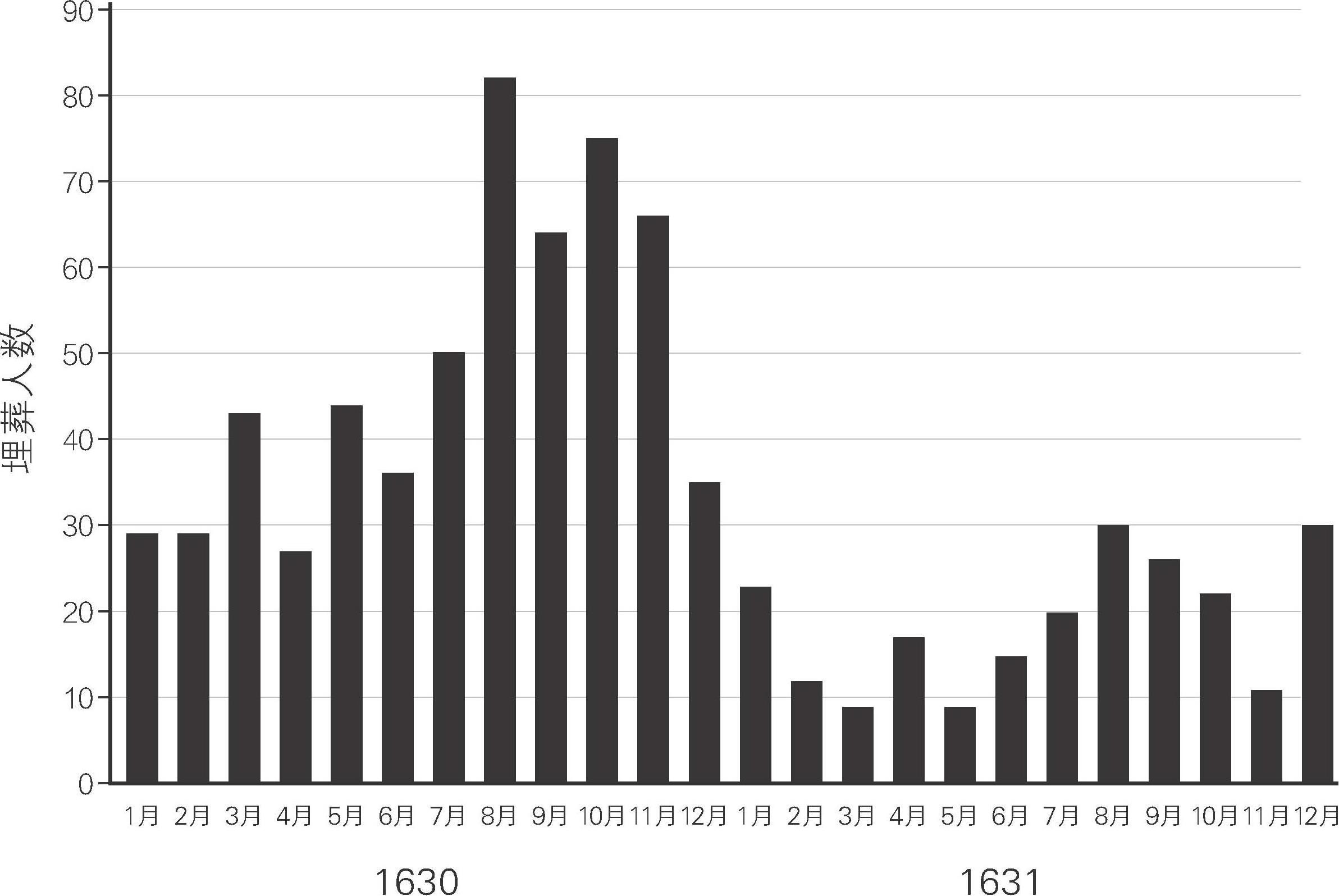 图表1.1 1630—1631年佛罗伦萨的瘟疫埋葬数据