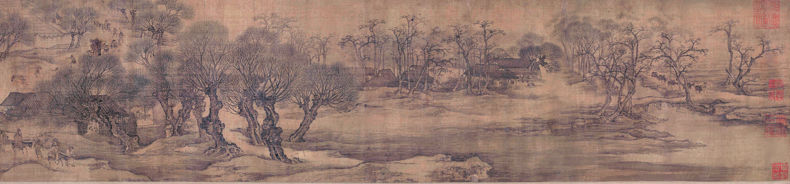 ◎ 《清明上河图》开场,汴京城郊,小桥流水,几户人家掩映树中